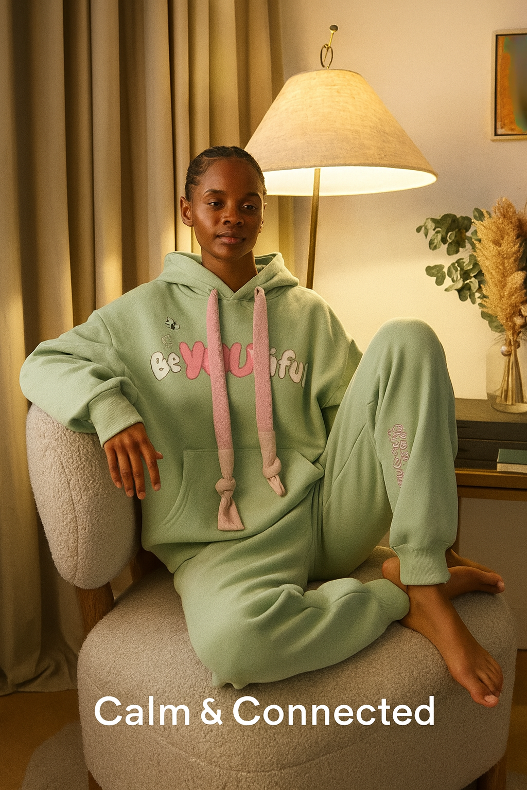 Calm & Connected creates oversized hoodies and sweatshirts designed for comfort and mental wellness. Each piece features gentle, affirming messages and soft fabrics that feel like a warm hug on difficult days.