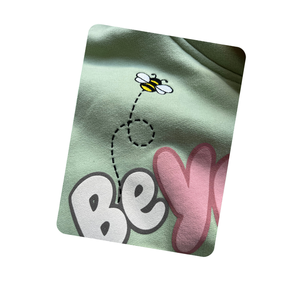 With gentle affirmations embroidered on the sleeves, a playful bee dancing across the chest, and padded multi-tone hoodie ties, this piece is designed for comfort with a message.
